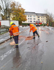 Im Clausthal-Zellerfelder Bohlweg befand sich eine Kraftstoffspur von einigen Hundert Metern Läge, zu deren Beseitigung die Feuerwehr am Nachmittag des 26.10.2025 alarmiert wurde. Aufgrund der Feuchtigkeit schillerte die Fahrbahn teilweise in voller Breite in allen Farben. Die Einsatzkräfte brachten ölbindende Mittel in den öffentlichen Verkehrsraum auf, um die Verunreinigungen zu binden und eine weitere Ausbreitung zu verhindern.