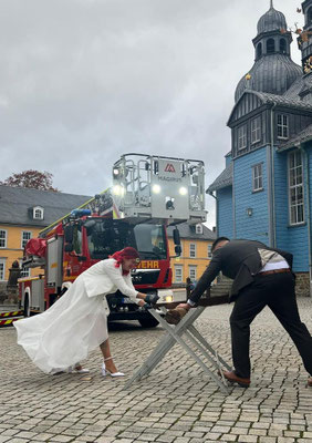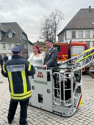 Am Samstag, den 25.10. gaben sich zwei aktive Mitglieder der Einsatzabteilung vor dem Standesbeamten in Clausthal-Zellerfeld das „Ja-Wort“. Lennart aus der Feuerwehr Wildemann und in Doppelmitgliedschaft in der Clausthal-Zellerfelder Wehr und Nathalie von der Feuerwehr Wildemann schlossen den Bund fürs Leben. Abordnungen der beiden Feuerwehren sowie der Fachgruppe Wasserrettung der Feuerwehr überbrachten dem Brautpaar die besten Wünsche für die kommende gemeinsame Zeit. Über die Drehleiter konnten die frisch Vermählten bei leicht getrübten Himmel die Aussicht in luftiger Höhe allein genießen.